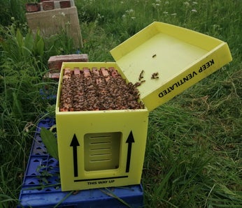 It is best to feed nuc colonies once they are in the hive. Set up a feeder and feed with 1:1 sugar syrup (1kg of sugar to 1ltr of water) to assist the bees in drawing out the frames and turning them into honeycomb.